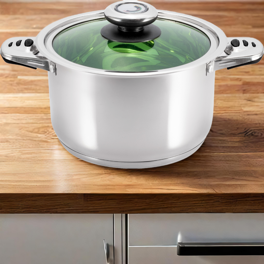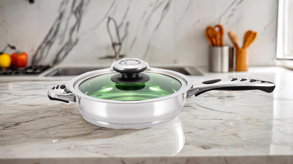 3 Marmites – 1 Poêle – 1 Casserole – 1 Passoire et 5 couvercles assortis avec “Thermocontrôle”.