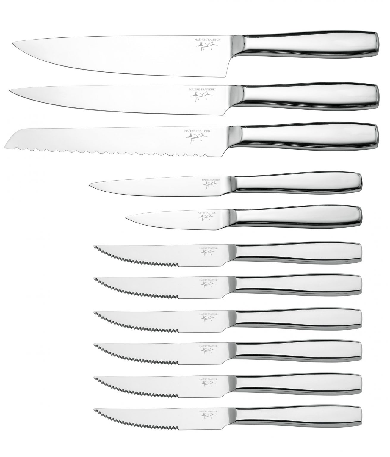 L’ensemble contient : 1x Couteau de Chef de 20 cm 1x Couteau à Trancher de 20 cm 1x Couteau à Pain de 20 cm